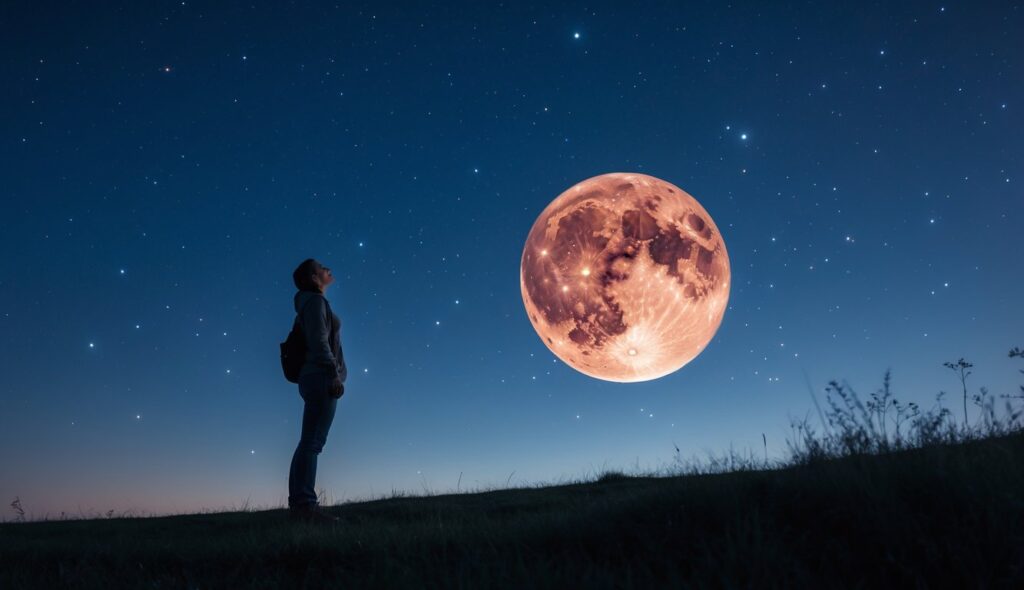 Seseorang berdiri di lapangan terbuka pada malam hari melihat ke langit yang gelap dengan planet Mars yang berwarna merah terang terlihat jelas di antara bintang-bintang.